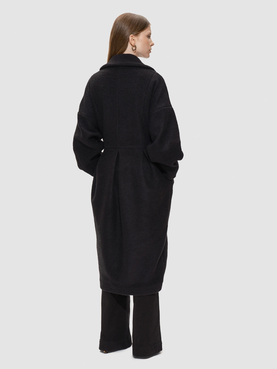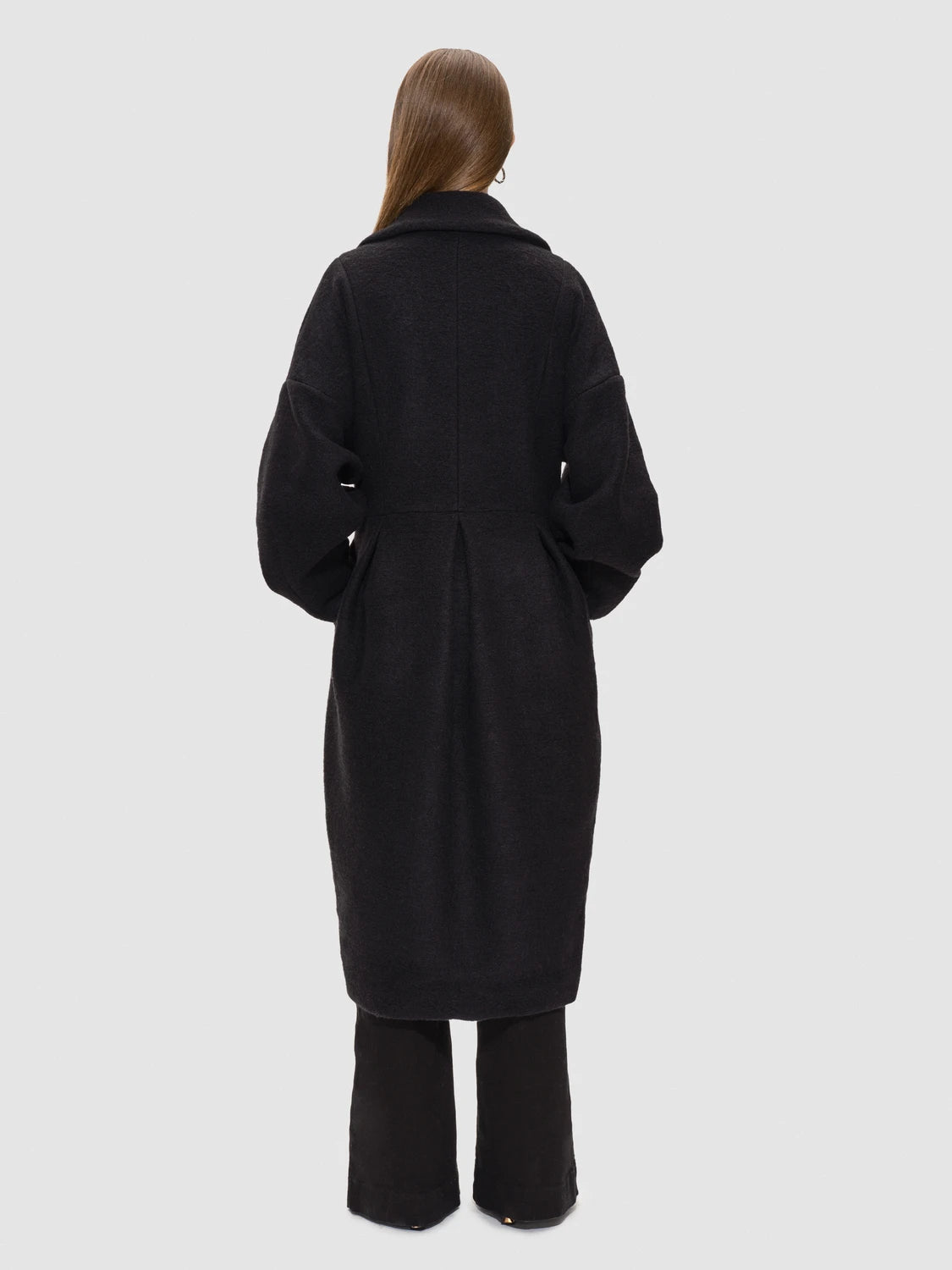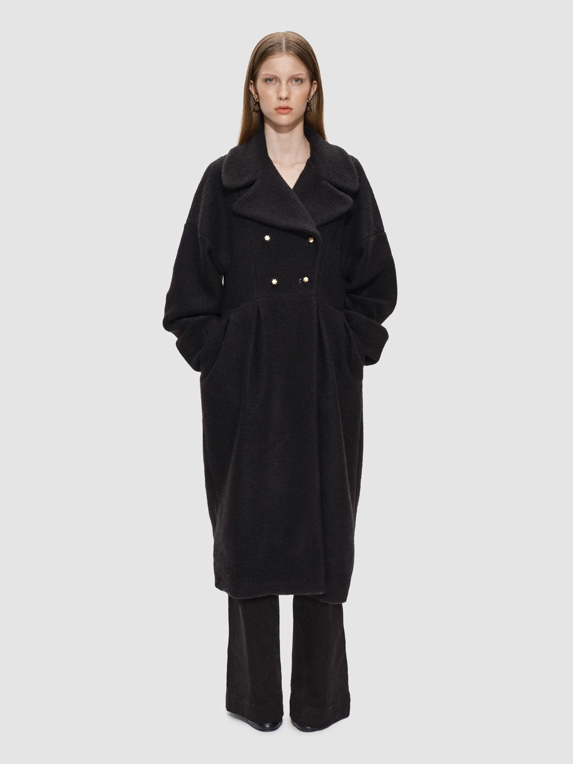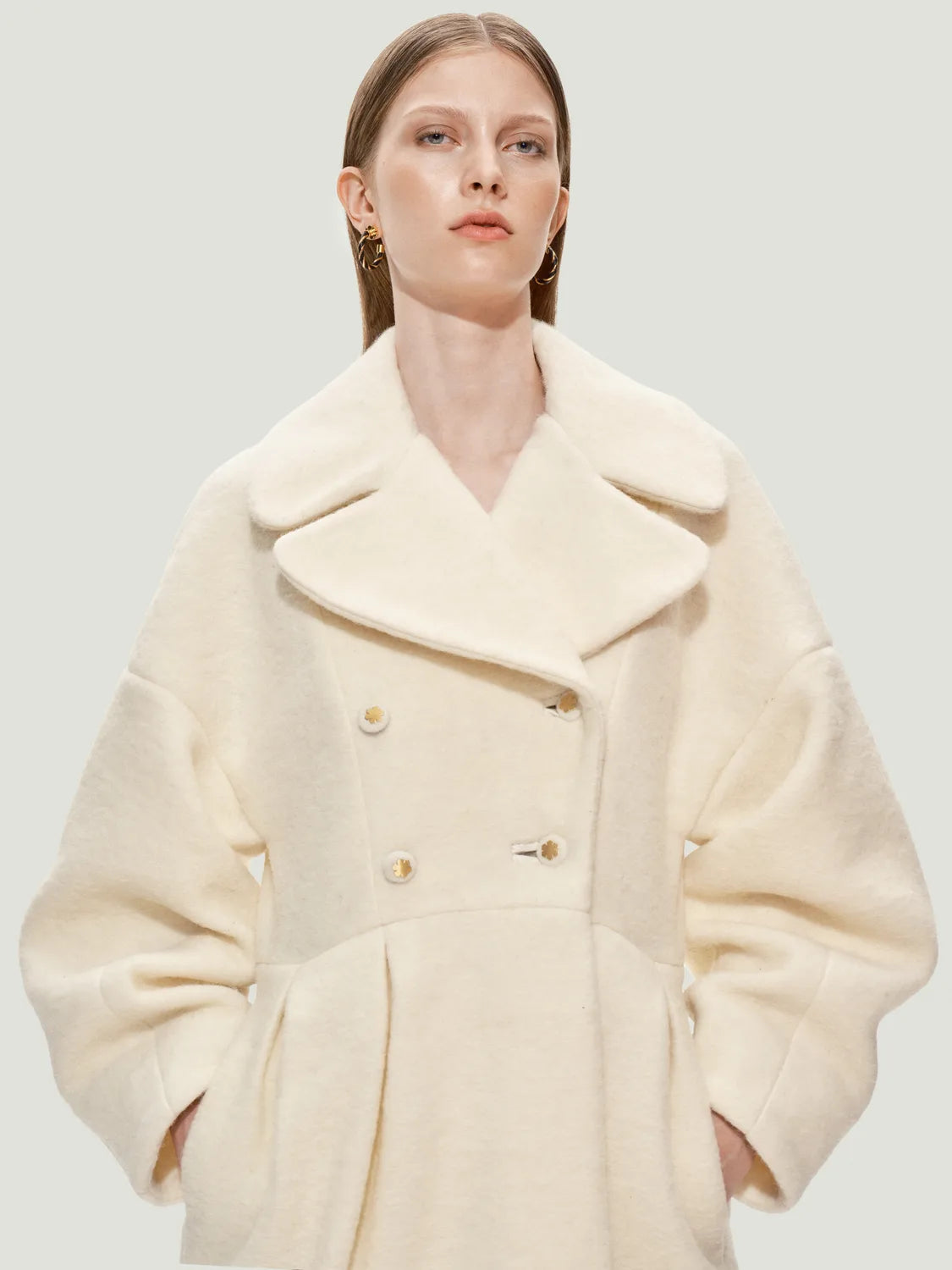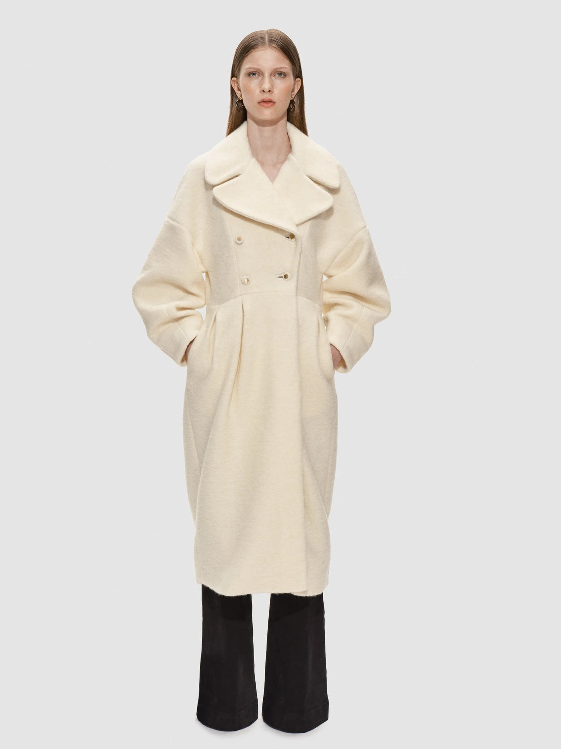 Hendes voluminøse ærmer og præcist skårede snit skaber et skulpturelt, men blidt udtryk, der smyger sig om kroppen med varme og ynde. Den dobbeltradet front og det brede revers giver karakter, mens taljen fremhæves med elegante læg, der åbner sig som blomsterblade i flor.