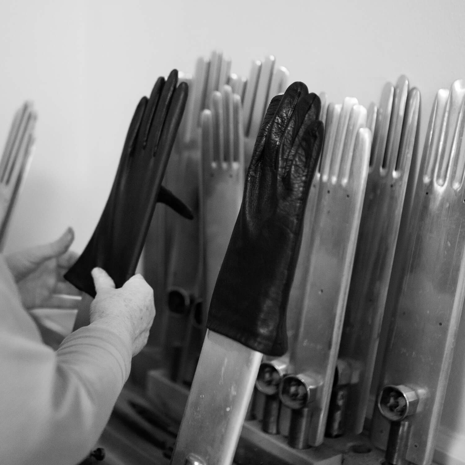 :: Vi stryger og presser handskerne, små ujævnheder glattes ud og handskerne kommer til at se helt nye ud