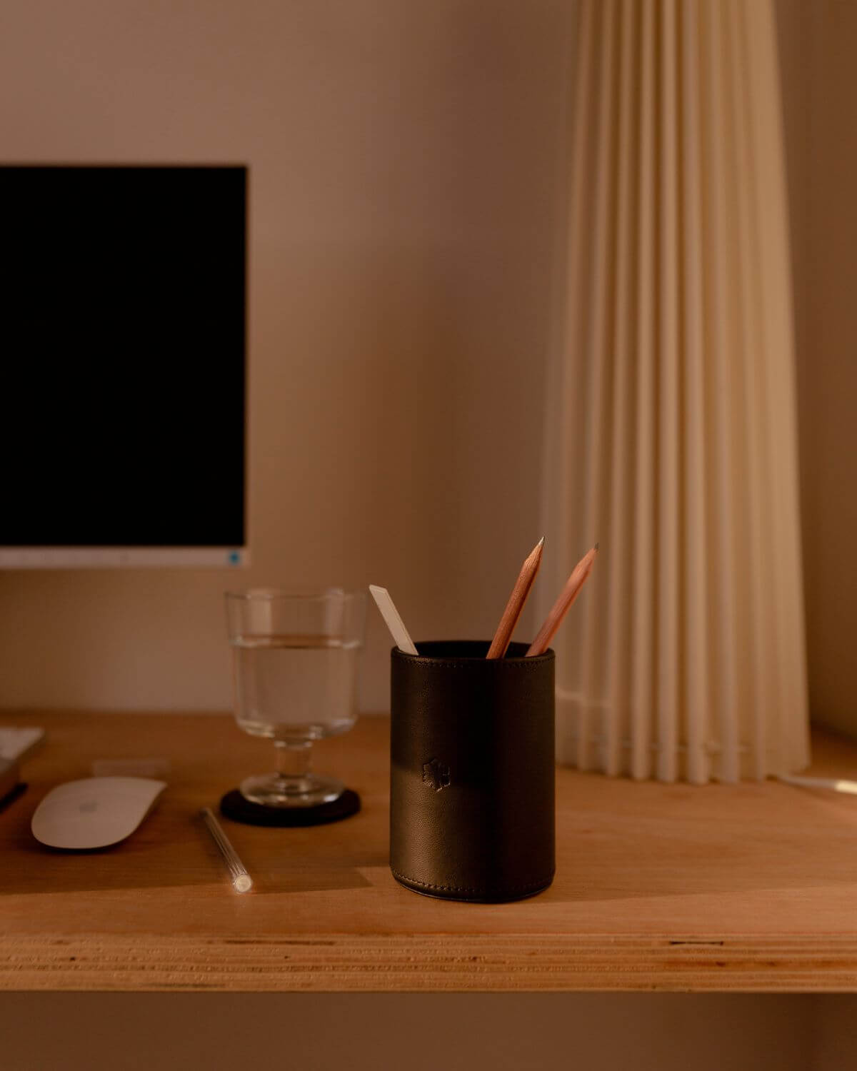 Skab smuk orden på dit skrivebord, konsolbord eller natbord med vores eksklusive Kalmus Pencil Holder i skind. Til opbevaring af dine yndlingsblyanter, kuglepenne eller blot til pynt.