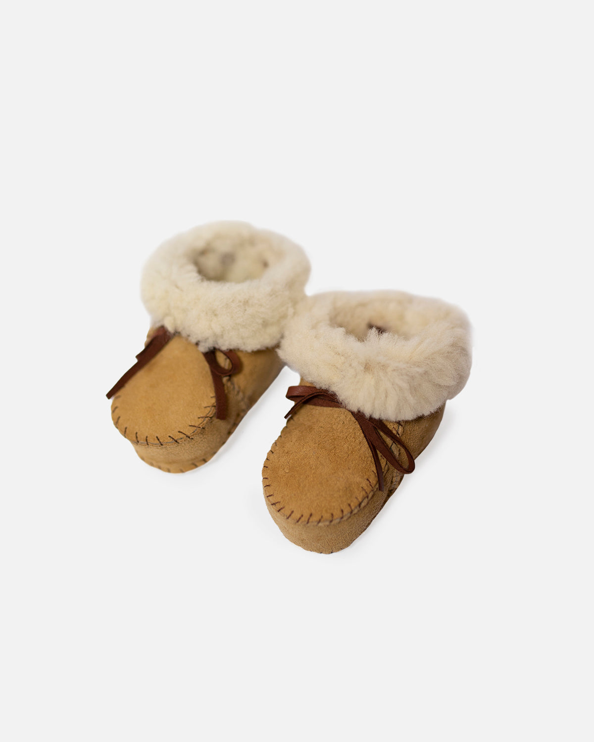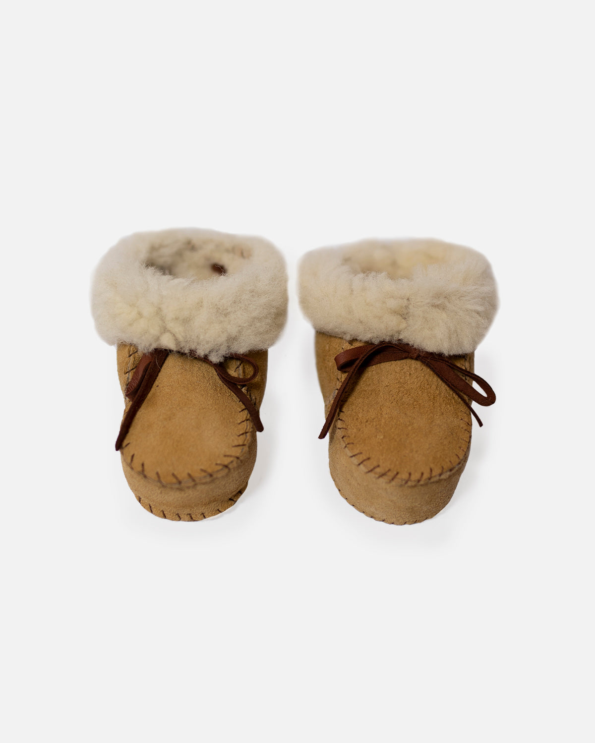 En blød og nuttet babysko, fremstillet på ansvarlig vis af vores værdifulde islandske lammeskind. Da vi aldrig kasserer noget, men altid forsikrer os at 'upcycle' vores produkter og materialer, har vi samlet afskæringer fra vores produktion af luffer og mokkasiner gennem 50 år.